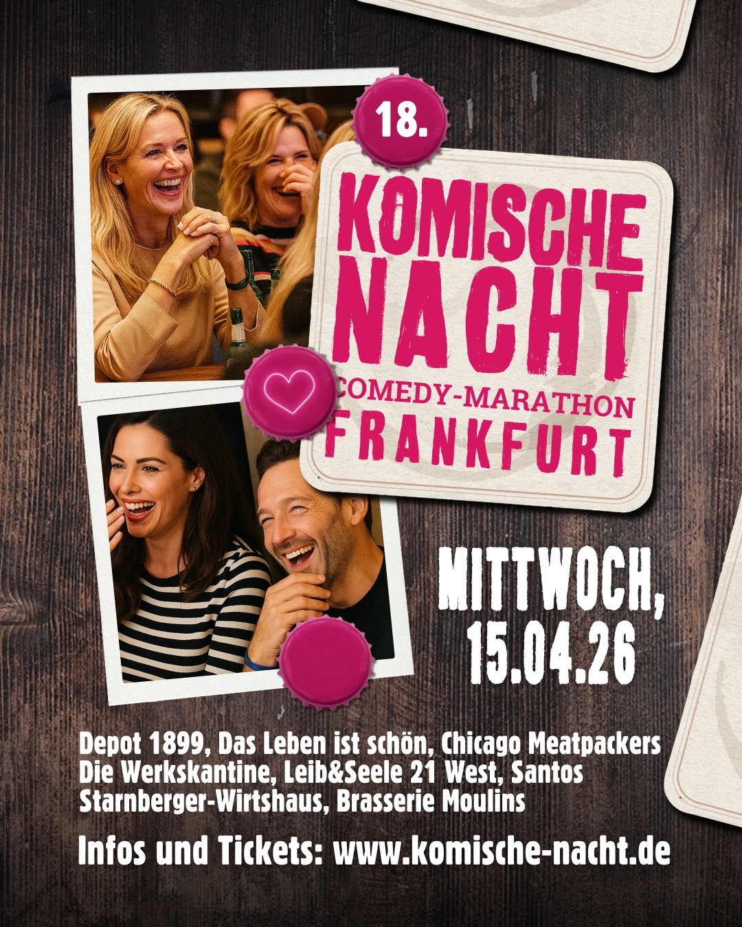 在第 18 届法兰克福“喜剧之夜”中,艺术家 Ben Schafmeister、C. Heiland、David Kebekus、Florentine Osche、Ill-Young Kim、Katharina Block、Laura Brümmer 和 Peter Löhmann 将在以下地点演出:法兰克福/巴特菲尔贝尔多林特公园酒店 Brasserie Moulins 餐厅、Chicago Meatpackers Frankfurt、Das Leben ist schön、Depot 1899、Die Werkskantine、Leib&Seele 21 West、Santos Frankfurt(原 360 Grad BBQ)、Starnberger-Wirtshaus。