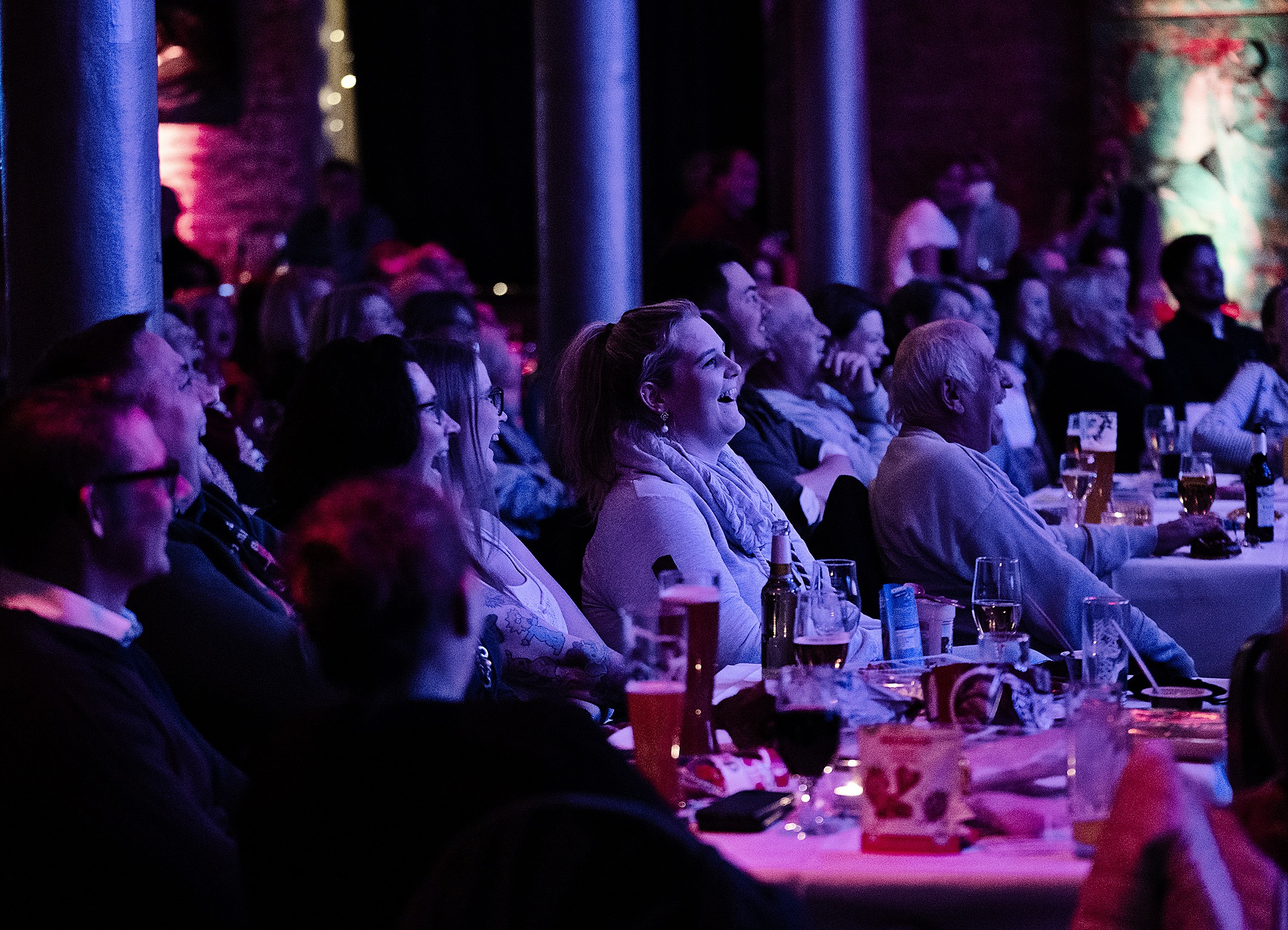 在这个夜晚,您总共可以现场欣赏到多达五场高水平的喜剧表演。在其他任何喜剧节目中,您都无法以如此实惠的价格获得这么多的乐趣。最棒的是,观众可以一直坐在自己喜欢的餐厅里,而演员们则在不同的演出地点之间轮换——这对艺术家来说是一场喜剧马拉松,而对观众来说则是舒适的享受。